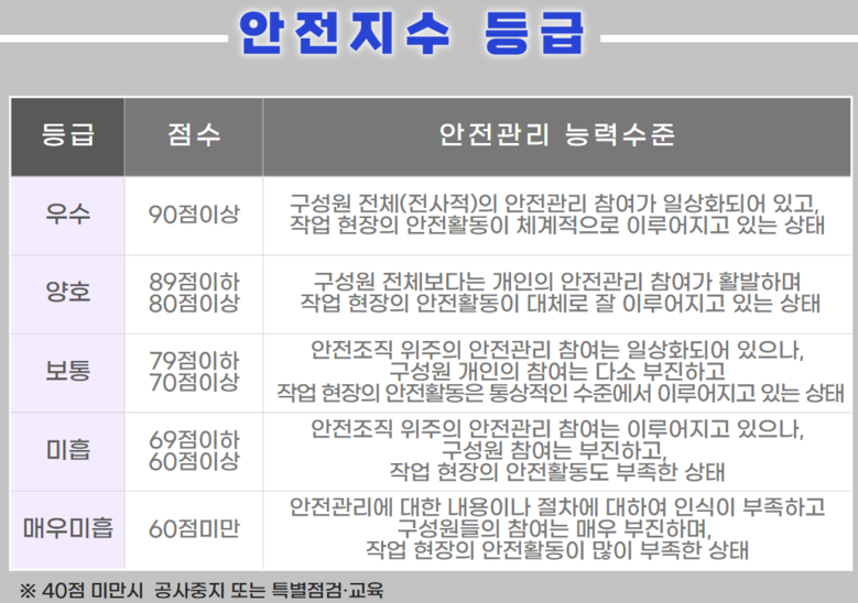 90점 이상은 우수로 구성원의 안전관리 참여가 일상화되고, 작업현장의 안전 활동 체계적으로 이뤄지고 있는 상태를 말한다. 60점 미만은 매우 미흡으로 안전관리 내용이나 절차에 대한 인식이 부족하고 구성원 참여 부진, 작업현장 안전 활동이 많이 부족한 상태다. 40점 미만인 경우 공사 중지 또는 특별점검과 교육 조치가 내려진다.