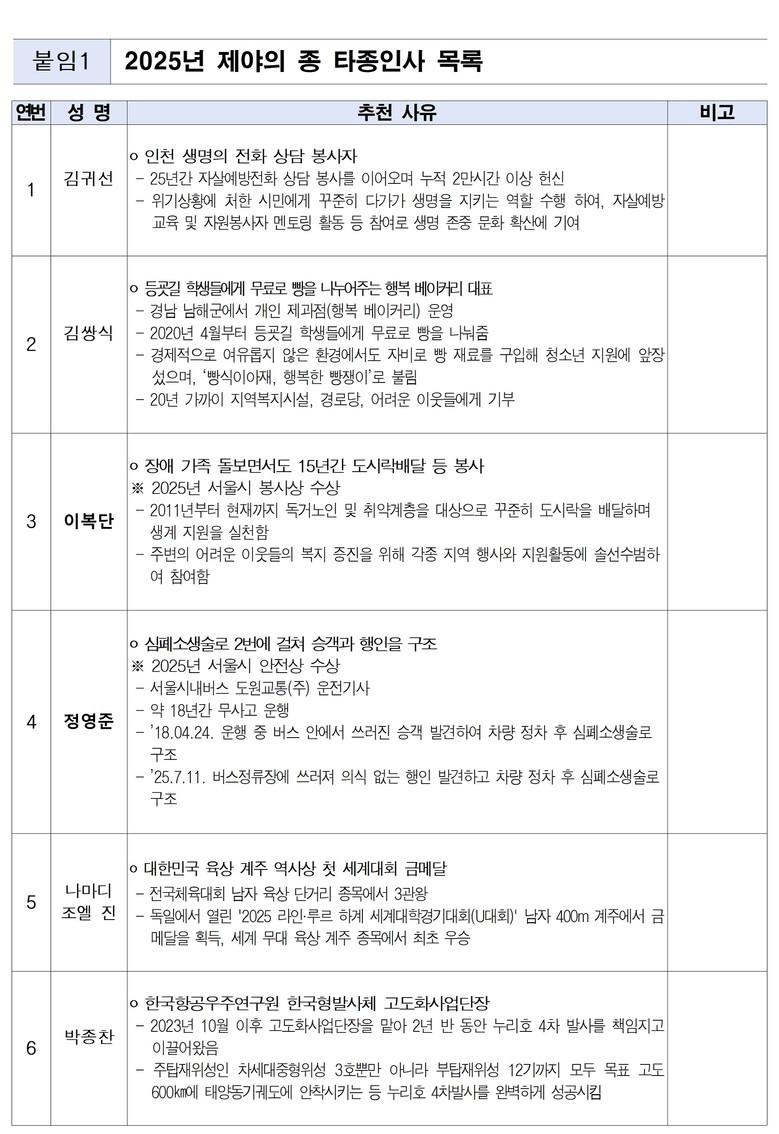새해를 알리는 33번의 타종에는 올 한 해 우리 사회에서 다양한 희망을 전한 시민 영웅들이 참여한다. ‘25년간 생명의 전화 상담을 이어온’ 김귀선 씨, ‘등굣길 학생들에게 무료로 빵을 나누어주는’ 김쌍식 씨, ‘15년간 도시락 배달봉사를 진행한’ 이복단 씨 등 다양한 선행을 펼쳐온 시민들이 타종에 참여한다. 또한 ‘지속적인 자선활동으로 선한 영향력을 끼치는’ 가수 션과 ‘한국 대중음악의 산증인’ 가수 양희은, ‘공감과 연대에 대해 이야기하는’ 작가 정세랑 씨 등 사회 각계각층을 대표하는 인사들도 함께하여 총 11명의 타종인사가 시민들과 함께 새해를 맞이한다.