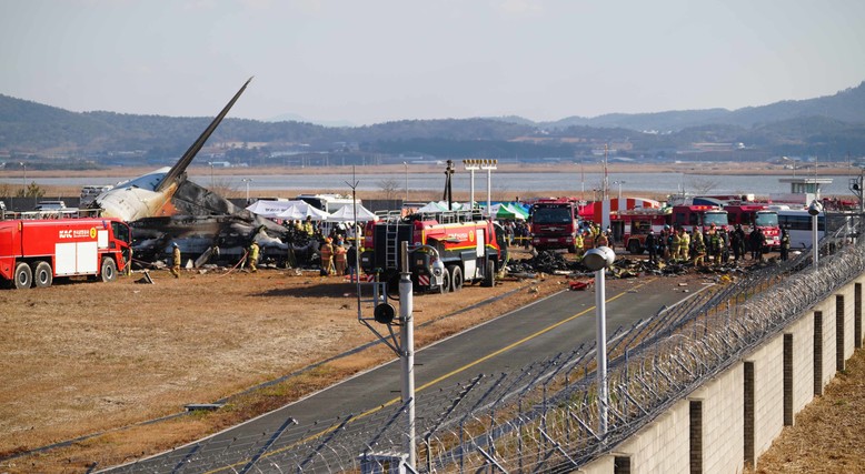 [무안 세계타임즈 = 우덕현 기자] 29일 오전 9시 3분께 전남 무안국제공항에서 태국 방콕발 제주항공 7C2216편이 착륙 중 활주로를 이탈해 폭발해 소방대원들이 구조 작업을 벌이고 있다. [전남도 제공.재판매 및 DB금지] 2024.12.29