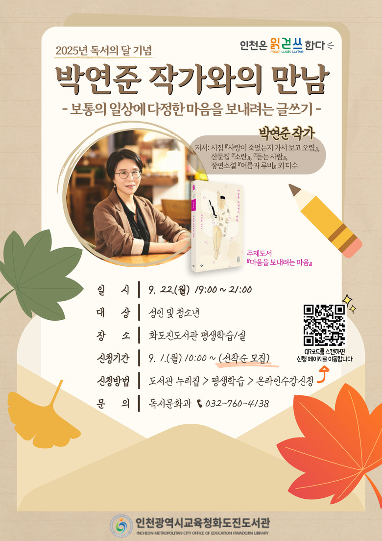 참가 신청은 9월 1일(월) 오전 10시부터 화도진도서관 누리집(https://lib.ice.go.kr/hwadojin/index.do)에서 선착순 진행하며, 글쓰기에 관심 있는 성인 및 청소년 누구나 참여할 수 있다.