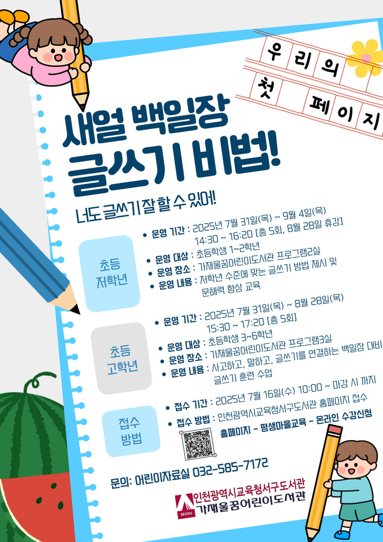 [인천 세계타임즈=심하린 기자] 인천광역시교육청서구도서관(관장 정연순)은 7월 31일부터 초등학생의 문해력과 창의적 표현 능력 향상을 위한 ‘새얼백일장 글쓰기 비법’ 프로그램을 운영한다.