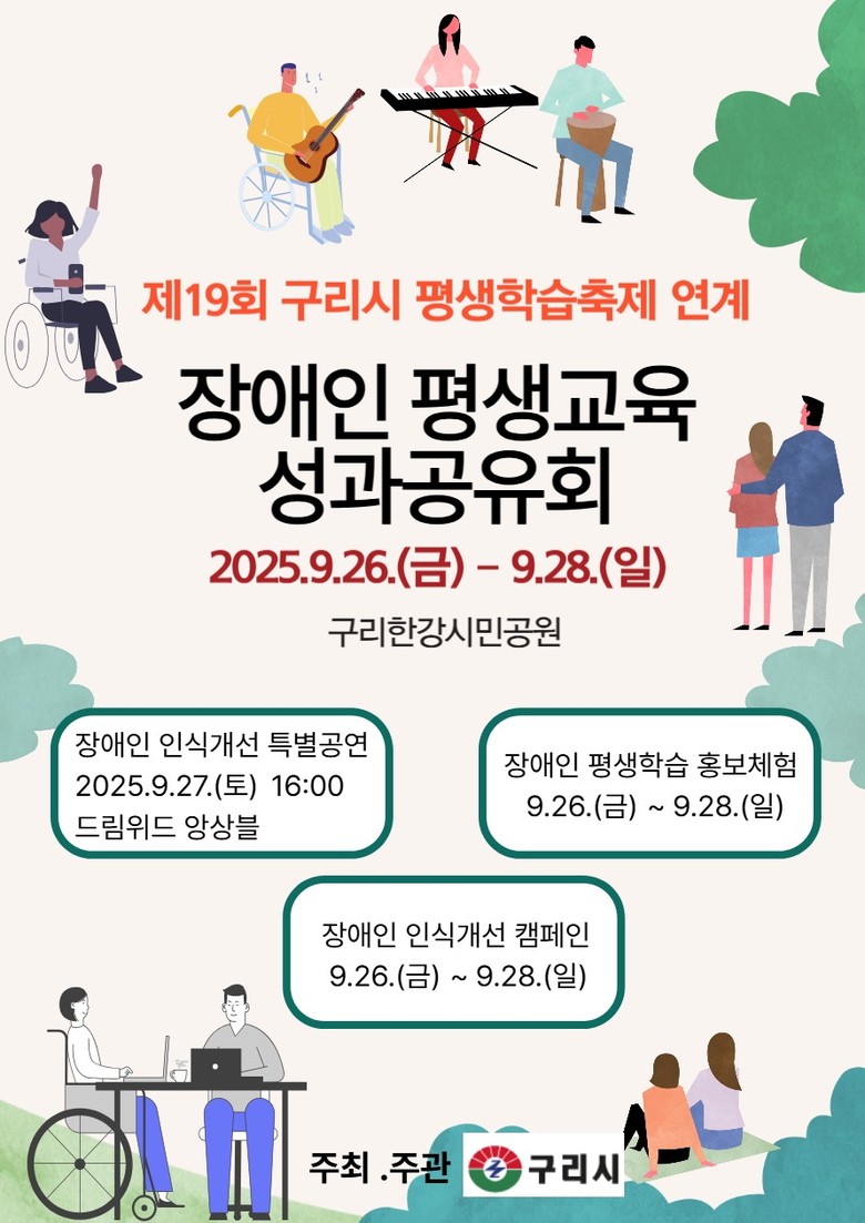 백경현 구리시장은 “장애인 평생교육 성과공유회를 통해 배움의 성과를 함께 나누고, 이를 통해 장애 인식 개선에도 앞장서겠다”라며, “앞으로도 모두를 위한 평생학습 환경 조성과 장애인 평생교육 활성화를 위해 더욱 노력하겠다”라고 말했다.
