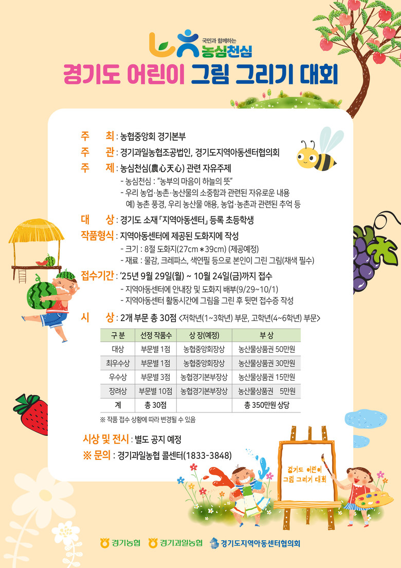작품접수는 9월29일부터 10월 24일(금)까지 진행되며, 저학년(1~3학년)과 고학년(4~6학년) 두 부문으로 나누어 총 30점의 작품이 선정되어 시상될 예정이다. 수상작은 오는 11월부터 12월까지 농협경기본부 신청사에 전시될 계획이다.