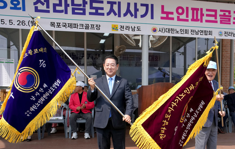 | ▲ 김영록 전라남도지사가 26일 목포 국제파크골프장에서 열린 ‘제3회 전남도지사기 노인파크골프대회’에서 전년도 우승기를 반환받고 있다. |