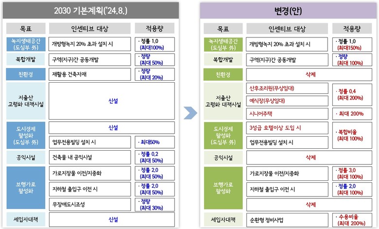 허용용적률 상향에 맞춰, 도심부 外에서 개방형녹지 조성에 따른 용적률 인센티브 최대값을 상향(100%→150%)하고, 저출산‧고령화 대책시설로서 산후조리원 및 예식장 도입에 따른 인센티브(최대200%), 정비사업 내 주거‧산업 세입자 대책 수립에 따른 인센티브(최대200%)를 신설한다.