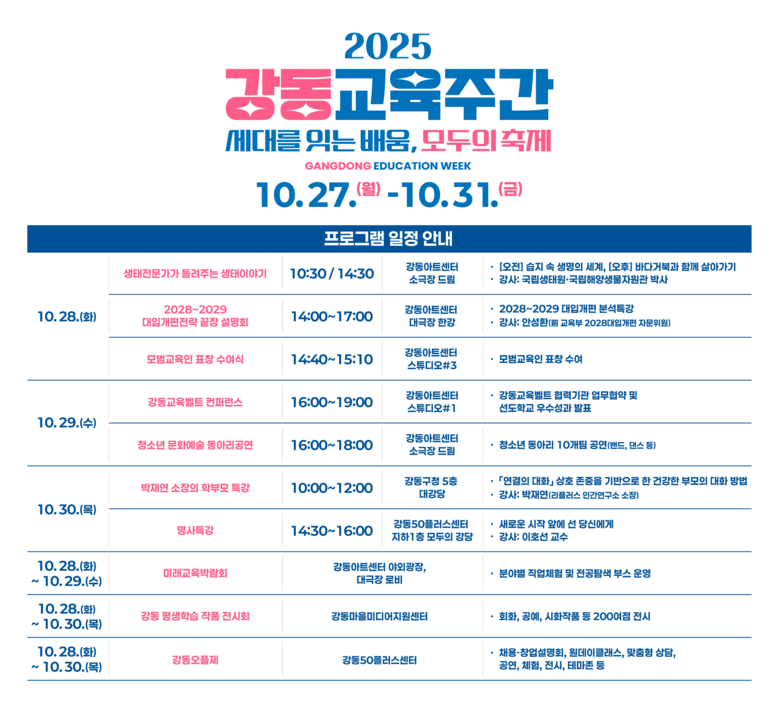 2025 강동교육주간의 날짜별 프로그램 등 자세한 사항은 강동구청 누리집(홈페이지)에서 확인할 수 있다.