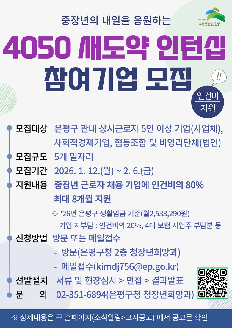 [은평구 세계타임즈=이장성 기자] 서울 은평구(구청장 김미경)는 직업 전환이 필요한 중장년 세대에게 양질의 일자리를 제공하기 위해 ‘4050 새도약 인턴십 프로그램’에 참여할 기업을 모집한다고 밝혔다.