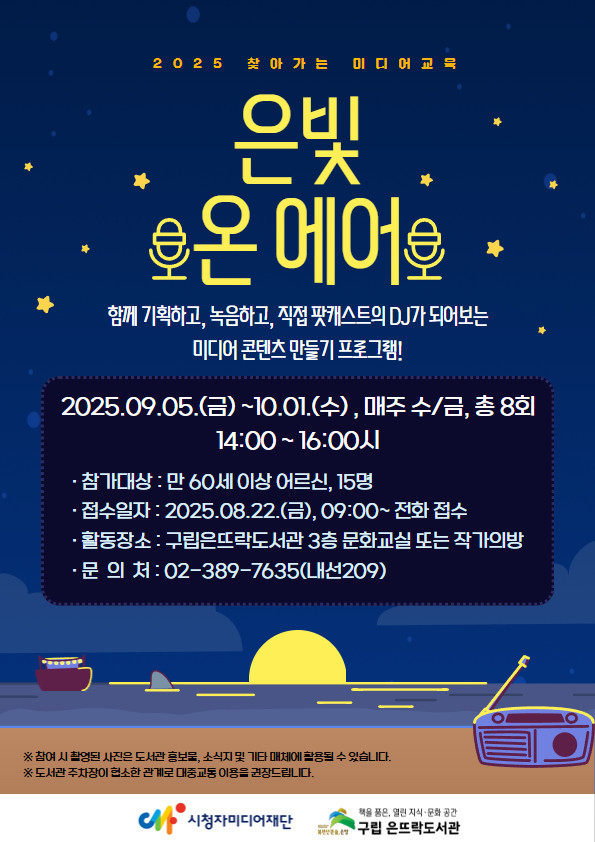 이번 프로그램은 시청자미디어재단이 주최하는 ‘2025년 찾아가는 미디어 교육’ 사업에 선정돼 마련됐다. ‘은빛 온 에어’는 어르신이 직접 기획, 녹음, 편집해 팟캐스트 활용법 등 미디어 활용을 실습해 보는 프로그램이다.