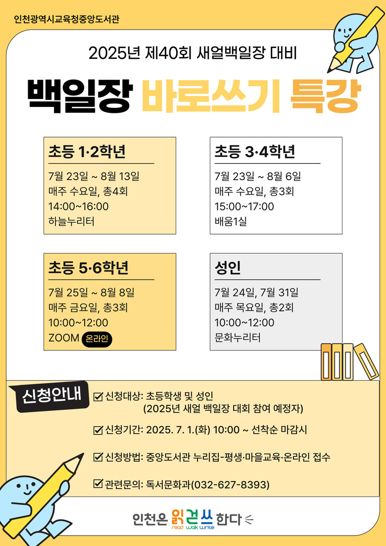 7월 1일부터 중앙도서관 누리집(lib.ice.go.kr/jungang/)에서 선착순 신청가능하며, 자세한 사항은 누리집 또는 독서문화과(☎032-627-8393)로 문의하면 된다.