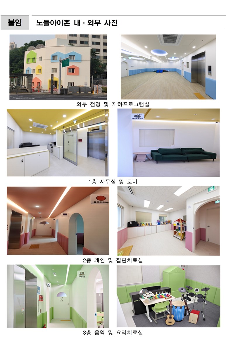이번에 문을 연 ‘노들아이존’은 지하 1층~지상 3층, 연면적 272.94㎡ 규모로 조성됐다. 언어.미술.놀이.음악치료, 심리검사 등 개별치료 프로그램과 교육.정서 지원 등 가족 프로그램을 제공할 수 있는 치료실, 상담실 등을 갖추고 있다.