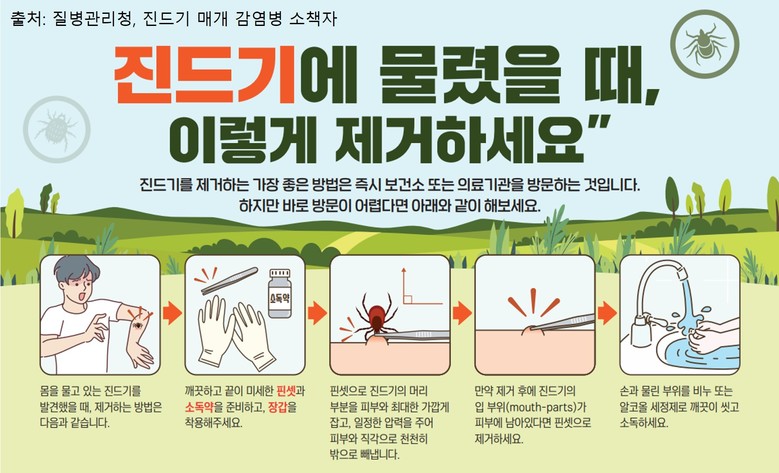 진드기에 물렸다면 깨끗하고 끝이 미세한 핀셋으로 진드기의 머리 부분을 피부와 최대한 가깝게 잡은 후 일정한 압력을 줘 피부와 직각으로 천천히 빼내야 한다. 제거 후 진드기의 입 부위가 피부에 남아있다면 핀셋으로 제거하고, 손과 물린 부위를 비누나 알코올 세정제로 깨끗이 씻고 소독하면 된다.