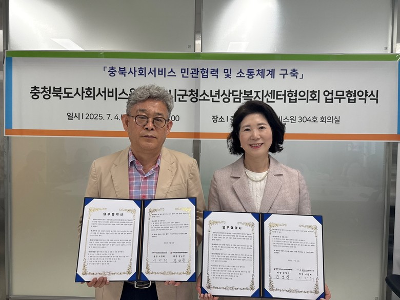 [충북 세계타임즈=이현진 기자] 충청북도사회서비스원(원장 이장희)과 충북시군청소년상담복지센터협의회(회장 김남진)는 2025년 7월 4일(금) 오전 11시, 충청북도사회서비스원 회의실에서 청소년 가족돌봄 지원과 사회서비스 협력체계 강화를 위한 업무협약(MOU)을 체결했다.