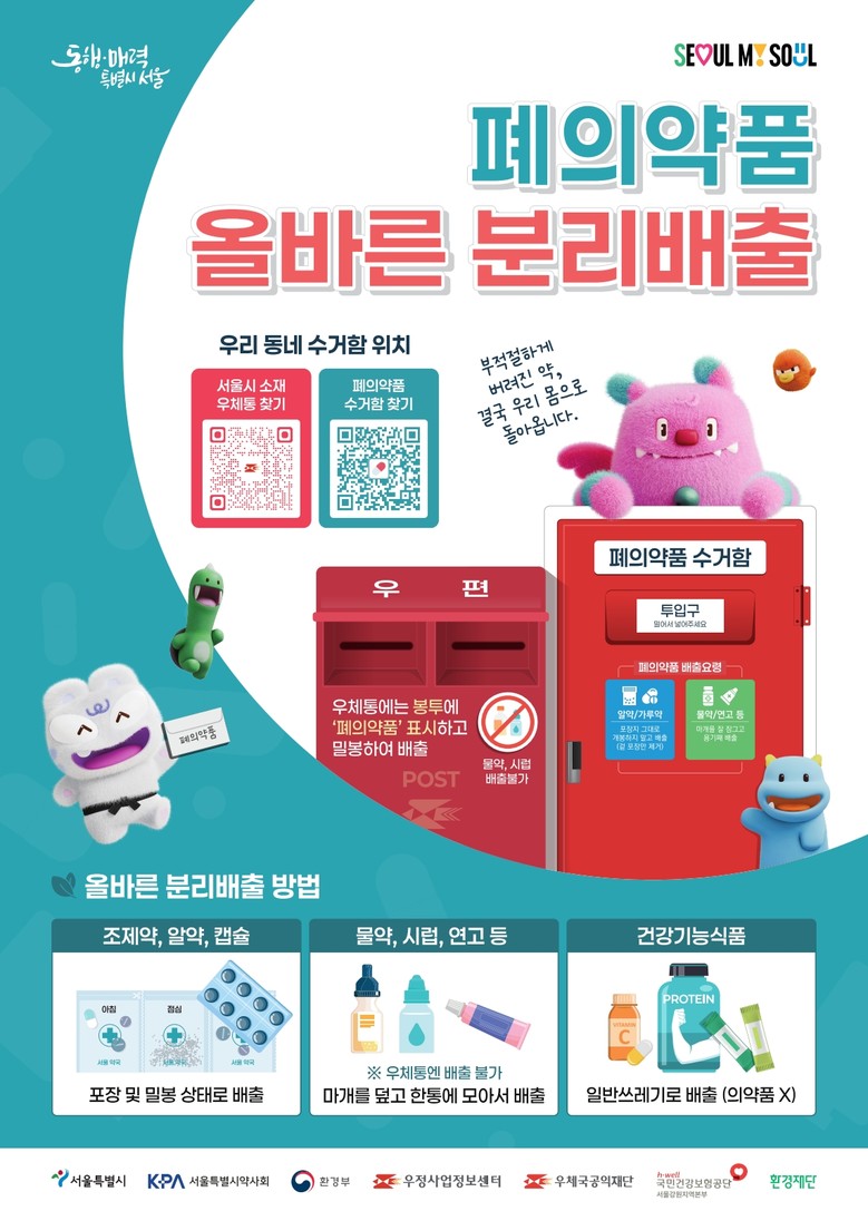 - 알약은 포장·밀봉 상태 그대로, 물약은 마개 덮어 배출…건강기능식품은 일반쓰레기 [서울 세계타임즈=이장성 기자] 가정 내 유통기한이 지났거나 복용 후 남은 약 등 항상 처치 곤란한 폐의약품, 서울시는 30일(화)부터 폐의약품 수거함 QR 스티커와 올바른 분리배출 포스터를 배포해 시민의 폐의약품 수거함 접근 편의성을 높인다.