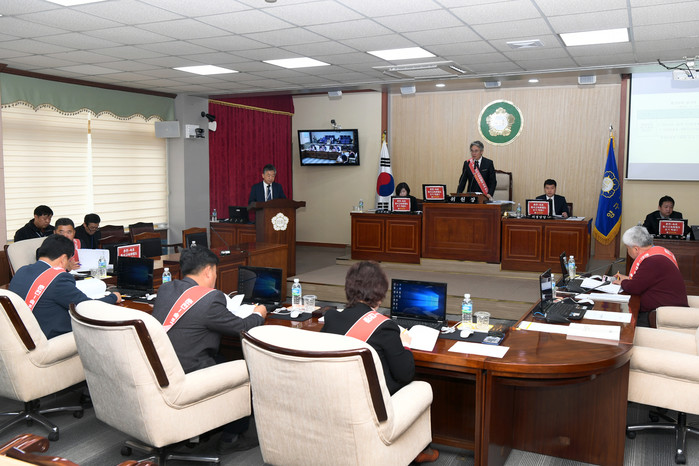 [양구군=세계타임즈 김민석 기자] 제248회 양구군의회 임시회 예결특위 제5차 회의가 10일 양구군의회 본회의장에서 열린 가운데 신철우예결특위위원장, 의원들이 춘천~속초 동서고속화철도 조기착공을 호소하는 어깨띠를 두르고 있다.