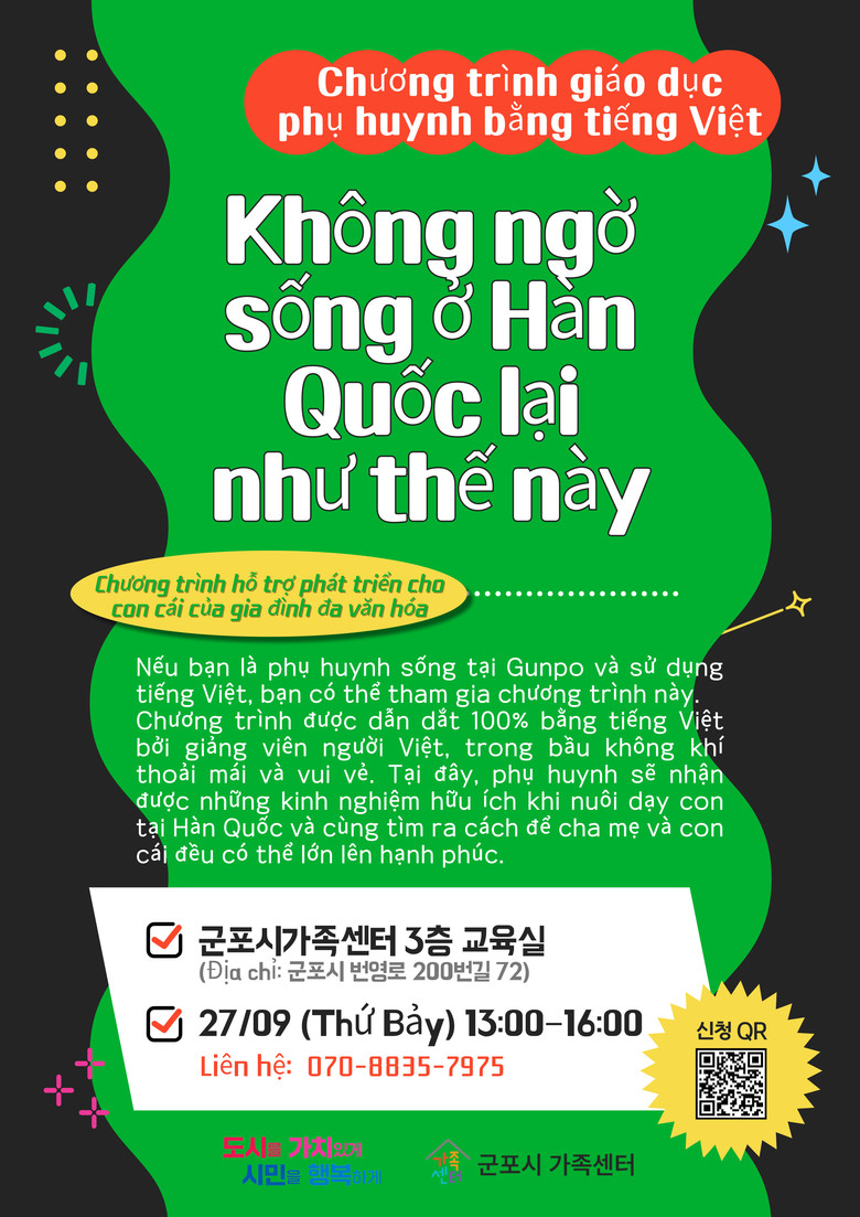 군포시가족센터 관계자는 “이번 부모교육은 베트남 부모님들이 모국어로 자녀 양육의 고민을 나누고, 존중하는 양육 방법을 함께 모색할 수 있다는 점에서 의미가 크다”며 “앞으로도 다양한 문화적 배경을 고려한 맞춤형 부모교육을 확대해 나갈 것”이라고 전했다.
