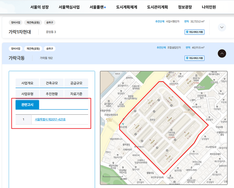 | ▲ 서울플랜+ 관련고시 제공 화면 예시 |