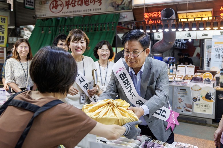 | ▲ 추석을 맞아 전통시장을 방문하여 상인들과 인사를 나누는 박강수 마포구청장 |