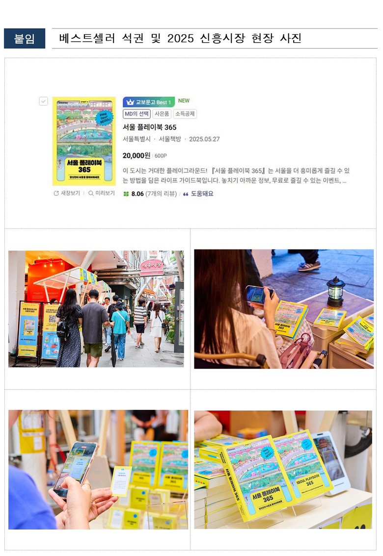 민수홍 서울시 홍보기획관은 “「서울 플레이북 365」는 정보 전달을 넘어, 서울이라는 도시를 직접 ‘탐험하고 해석하는’ 새로운 형식의 정책 콘텐츠”라며, “온라인 베스트셀러 등극과 오프라인 현장 호응은 시민들이 정책을 삶의 일부로 받아들이고 있다는 강력한 신호”라고 밝혔다.