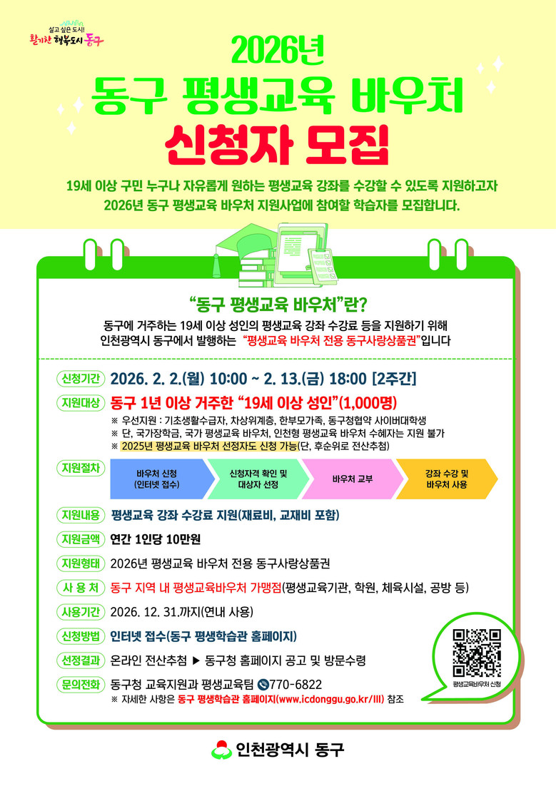 이번 사업은 동구에서 거주하는 19세 이상 성인 1천명의 평생교육 수강을 지원하고자 마련됐다. 구는 신청자들이 원하는 평생학습 강좌를 자유롭게 수강할 수 있도록 1인당 연간 10만원의 평생교육 바우처를 지원한다.