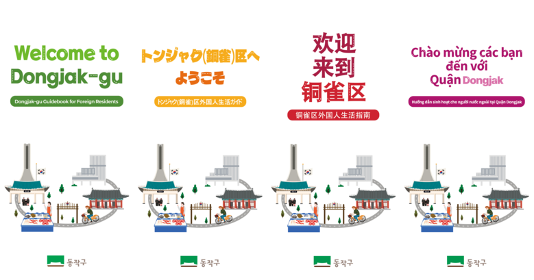 | ▲ ‘동작구 외국인 생활안내서’ 언어별 표지 시안(왼쪽부터 영어, 중국어, 일본어, 베트남어) |