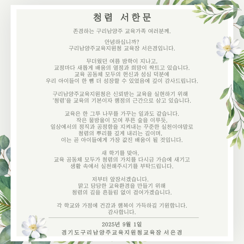 ◦ 정직과 공정함을 생활 속에서 지켜내는 꾸준한 실천 당부 [남양주시 세계타임즈=송민수 기자] 구리남양주교육지원청(교육장 서은경)은 2025년 2학기를 맞아 교육지원청 각 부서와 관내 각급 학교에 청렴 서한문을 발송했다. 이번 서한문에는 여름 방학을 마치고 새 학기를 시작하는 시점에서 교육공동체 모두가 청렴의 가치를 다시금 새기고, 일상 속 정직과 공정함을 지켜내는 꾸준한 실천을 통해 신뢰받는 교육환경을 만들어가자는 메시지가 담겼다.