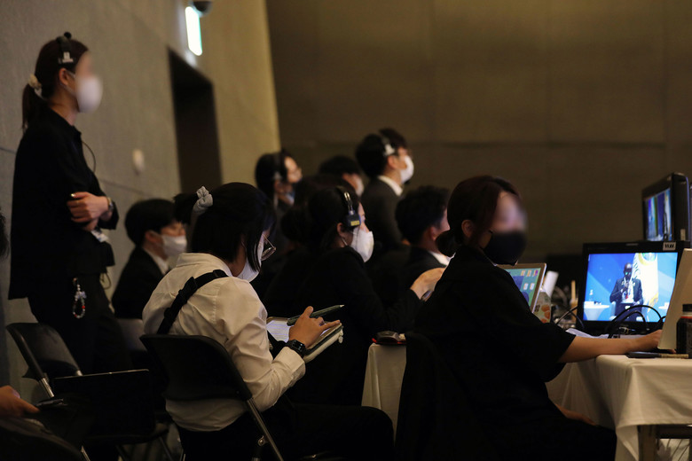 18일 HWPL 9·18 평화 만국회의 제9주년 기념식 행사장에서 HWPL 행사운영국 인터넷방송 스태프들이 콘퍼런스를 온라인 생중계하고 있다.