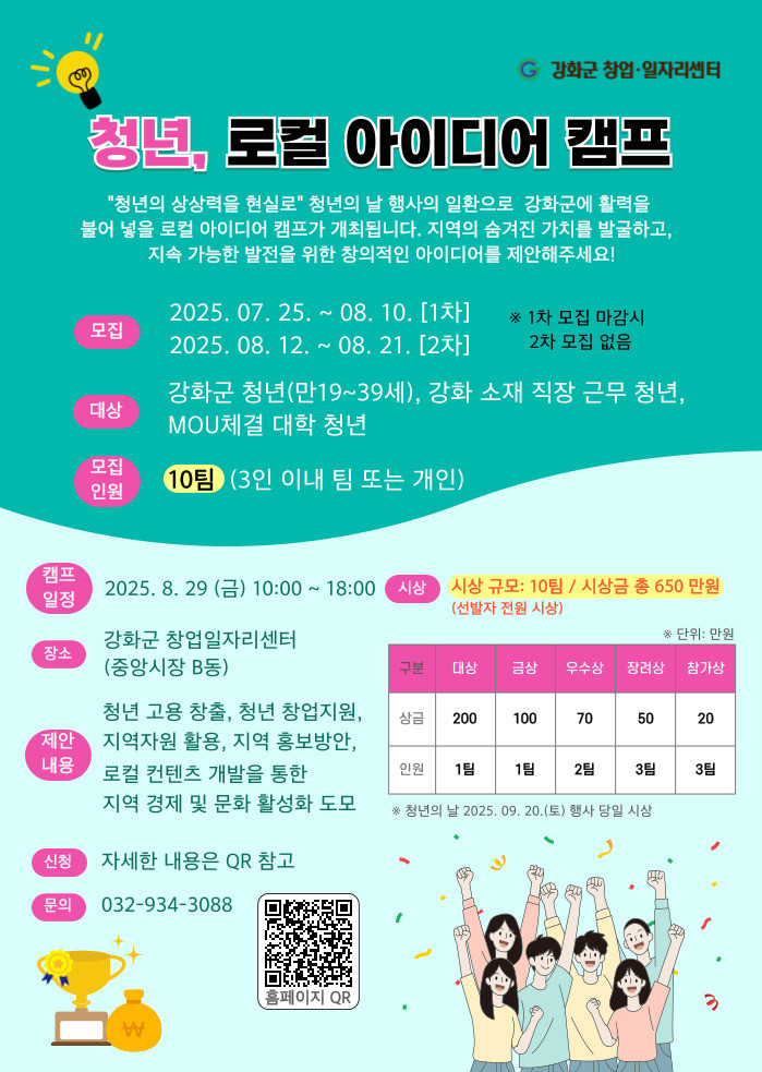 신청은 QR코드를 통해 가능하며, 기타 문의 사항은 강화군 창업·일자리센터(☎032-934-3088,)로 문의하면 된다.