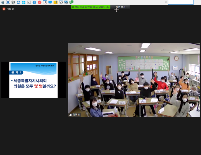 세종특별자치시의회(의장 이태환)는 “코로나 시대에 미래의 주역인 으뜸초등학교 학생들이 온라인 청소년 의회교실을 통해 의회의 의사결정을 비롯한 풀뿌리 민주주의 경험이 소중한 자산이 되었기를 바란다”면서 “세종시의회는 청소년들의 의견에 귀 기울여 청소년들이 마음껏 꿈을 펼치도록 다양한 제도와 정책을 개발하는 데 더욱 노력하겠다”고 말했다.