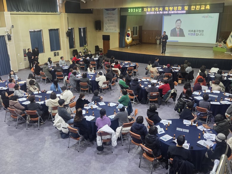 이번 교육은 오는 3월 ‘2026년 미추 자원순환 가게’ 본격 운영을 앞두고 선발된 자원관리사 69명이 참석한 가운데 진행됐다. 교육 과정은 ▲식전 힐링 체조를 시작으로 ▲자원관리사 직무 전문 교육 ▲현장 작업 안전교육 등 다채로운 프로그램으로 구성됐다.