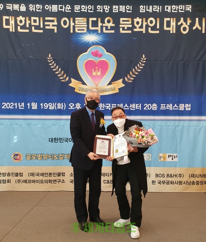 [세계타임즈 이판석 기자]최근 코로나19 극복을 위한 "힘내라 대한민국 2021" 희망캠페인으로 열린 '2020 대한민국 아름다운문화인대상 시상식(이하 아름다운문화인대상)'이 대한민국아름다운문화인대상 조직위원회(공동조직위원장 우덕수, 김태후)가 주최하고 글로벌뷰티엔컬쳐협회, 뷰티엔패션, 월간문화, 포탈뉴스 공동주관으로 한국프레스센터 20층 프레스클럽에서 지난 19일 오후3시에거 열렸다.
