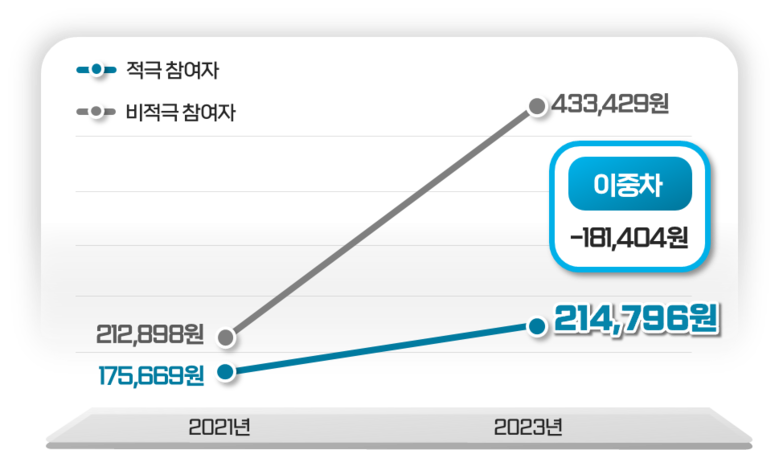 적극참여자의 외래비는 ’21년 47만2457원에서 ’23년 62만9161원으로 15만6704원 늘었고, 비적극 참여자 외래비는 58만2981원에서 82만5874원으로 24만2893원 증가했다. 적극참여자의 증가폭이 8만6189원 적은셈이다. 입원비 증가폭도 적극 참여자가 18만1,404원 적었다.