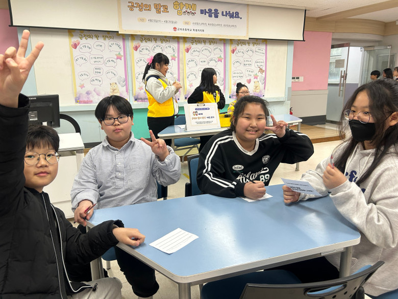 [시흥시 세계타임즈=송민수 기자] 군자초등학교(교장 우승룡)는 4월 23일부터 25일까지 3일간, 전교생을 대상으로 인성브랜드 집중 실천 주간을 맞이하여 ‘바른 언어 사용 캠페인’을 실시하였다. 이번 캠페인은 학생자치회가 주도하여 긍정의 말을 나누고 우정을 키우는 부스형 활동으로 진행되었으며, 학년별로 일정을 나누어 후관 1층 드림랜드에서 운영되었다.