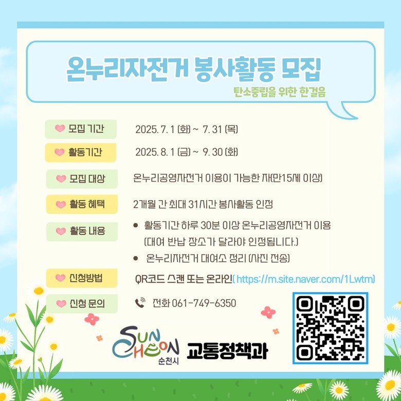 이번 3기 신청은 인터넷 접수(https://naver.me/x5mN5KGw)만 가능하며, 자세한 사항은 순천시청 누리집에서 확인할 수 있다. 기타 문의는 순천시 교통정책과(061-749-6367)로 하면 된다.