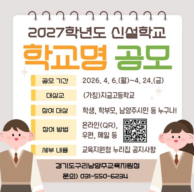 경기도구리남양주교육지원청, 2027년 신설학교 학교명을 공모합니다!