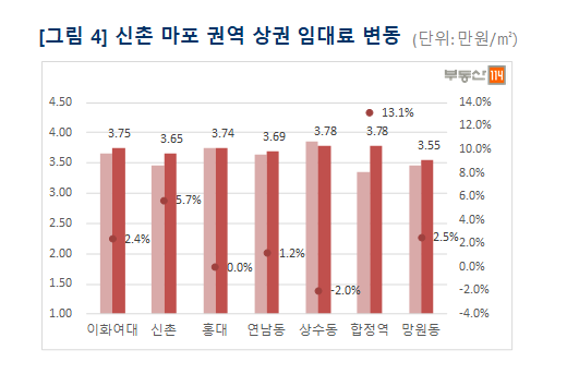 신촌마포권역에서는 마포권역 내 상권 중심으로 분위기가 활발했다. 망리단길로 유명세를 타며 인기가 이어지는 망원동 상권은 당분기 ㎡당 3.55만원으로 전분기 대비 2.5% 상승했다.