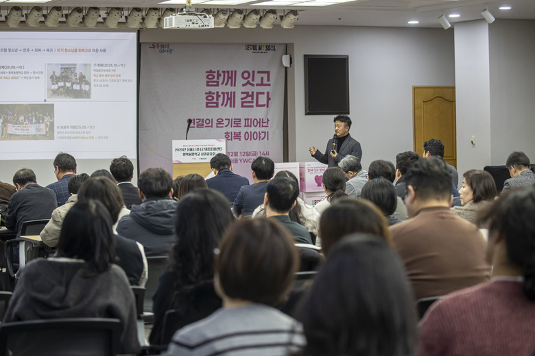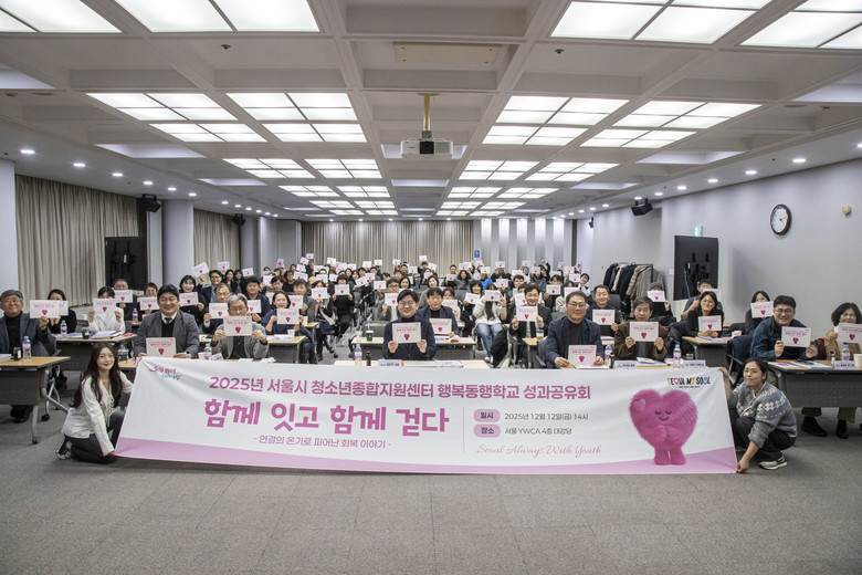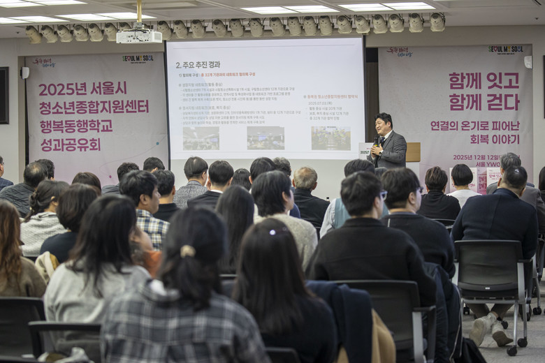 [서울 세계타임즈=이장성 기자] 서울시는 지난 12월 12일(금) 서울YWCA 대강당(중구 명동)에서 청소년과 보호자, 시설 관계자 등 130여 명이 참석한 가운데 「2025 청소년행복동행학교‧청소년종합지원센터 성과공유회」를 개최했다. ‘함께 잇고 함께 걷다’를 주제로 지난 1년간 서울시가 추진해 온 위기청소년 지원 사업의 운영 성과와 주요 사례를 공유하고 향후 발전 방향을 논의했다.