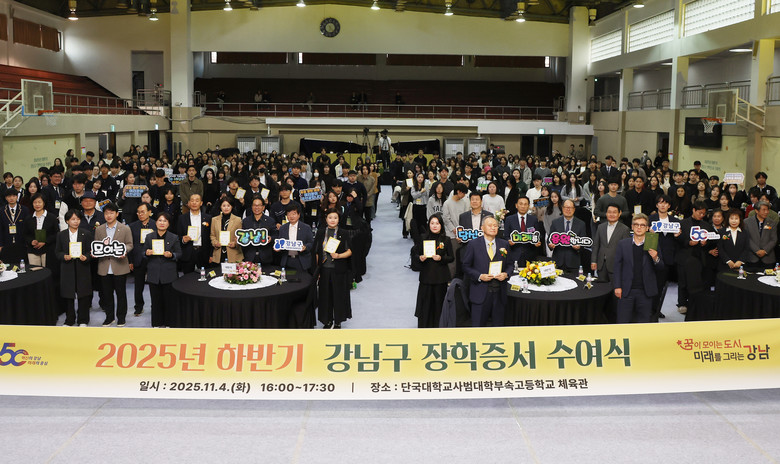 [강남구 세계타임즈=이장성 기자] 꿈이 모이는 도시, 미래를 그리는 강남구(구청장 조성명)가 11월 4일 단국대학교사범대학부속고등학교 체육관에서 ‘2025년 강남형 장학사업’ 하반기 장학증서 수여식을 열고, 고등학생과 대학생 등 총 240명에게 4억4천만 원의 장학금을 전달했다. 개청 50주년을 맞아 올해 시작된 이 사업을 통해 상·하반기 총 313명이 5억5천7백만 원의 장학금을 받았다.