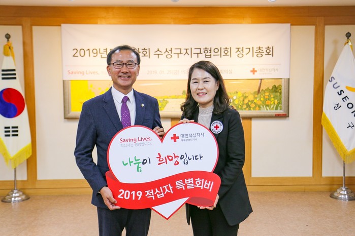 [수성구=세계타임즈 한성국 기자] 수성구의회 김희섭 의장은 지난 25일 수성구청 2층 회의실에서 개최된 ‘대한적십자봉사회 대구수성구지구협의회 2019년 정기총회’에 참석, 적십자 특별회비 100만원을 전달하고 지역사회 사랑나눔 봉사 활성화에 기여한 유공자 3명에게 표창을 수여하였다.