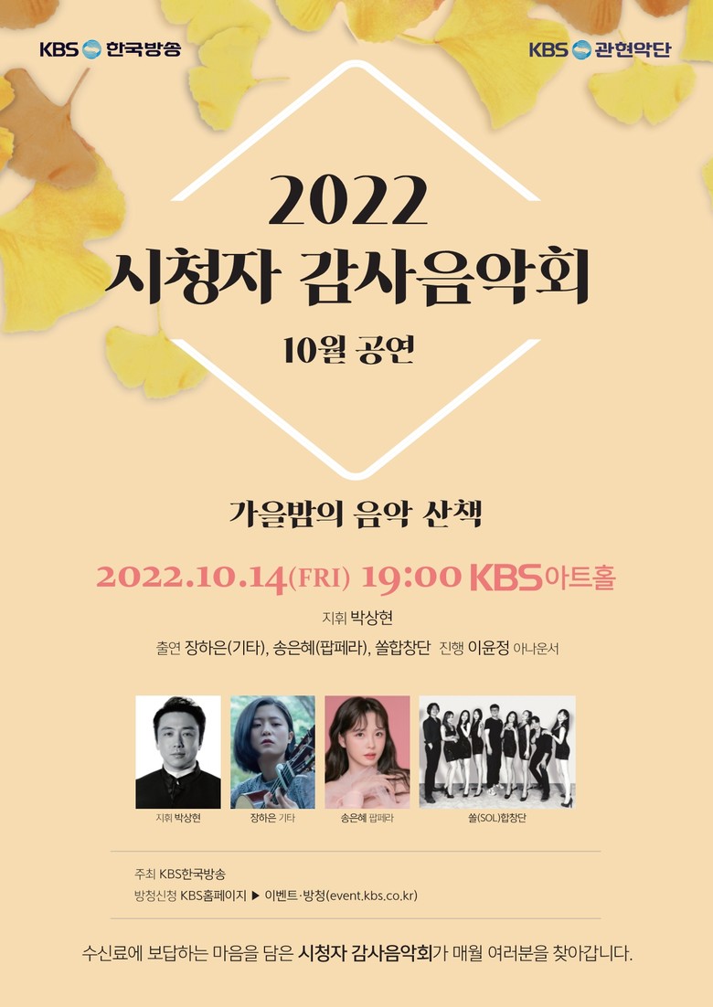 [세계타임즈 = 백진욱 기자] KBS가 오는 10월 14일 여의도 KBS아트홀에서 '2022 시청자 감사음악회' 10월 KBS관현악단 공연 ‘가을밤의 음악 산책’을 개최한다.