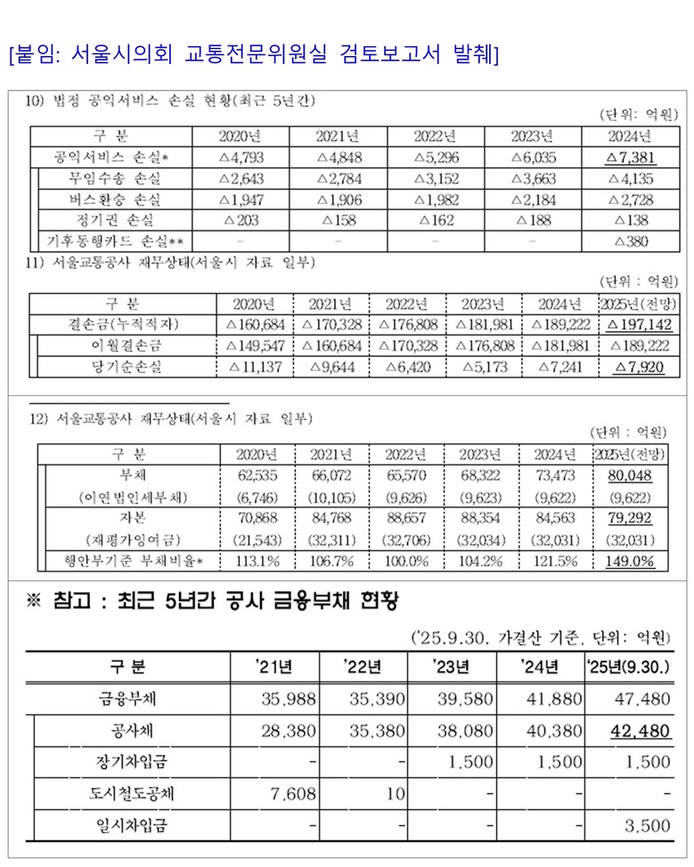 그러나 만기 상환을 위해 다시 공사채를 발행하는 악순환이 고착되며 재정 부담은 임계치에 도달하고 있다. 서울교통공사의 2025년 당기순손실은 7,920억 원, 누적적자(결손금)는 19조 7,142억 원, 부채비율은 149%로 전망된다. 이는 행정안전부의 도시철도 공사채 발행 승인 기준(130%)을 초과해 추가 재원 조달도 제한되는 재정 위기 상황이다.