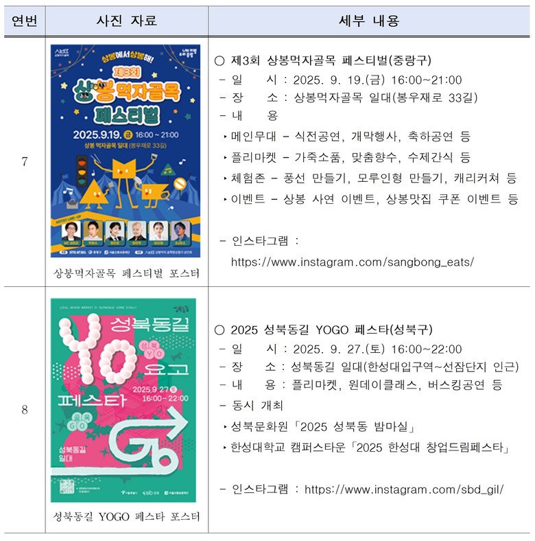 한편, 지난 9월 열린 중랑구 「상봉먹자골목 페스티벌」과 성북구 「성북동길 YOGO페스타」는 시민 2만여 명이 다녀가며 성공적으로 마무리됐다.