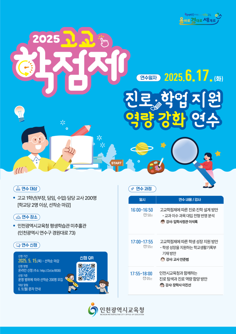 또한 오는 6월 17일에는 인천시교육청평생학습관에서 고교학점제 운영에 필요한 실무 역량 향상을 위해 교사를 대상으로 진로·학업 설계 역량 강화 연수를 실시한다.