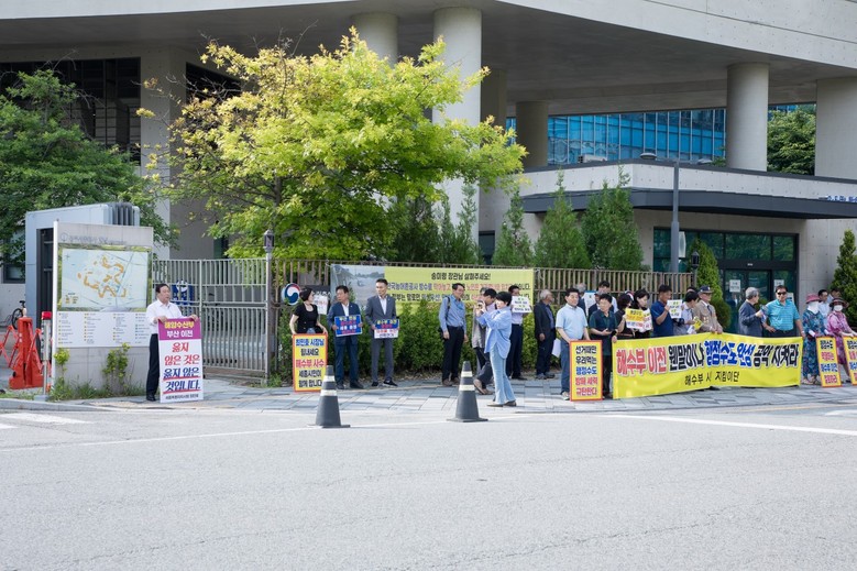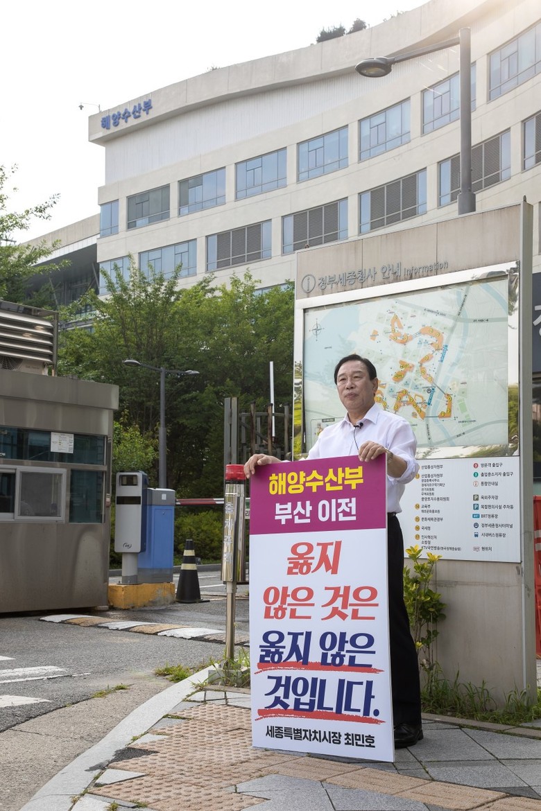 [세종 세계타임즈=이채봉 기자] 최민호 세종시장이 4일 정부세종청사 해양수산부 입구에서 '해수부 부산 이전 반대' 1인 시위를 전개하고 있다. 최민호 시장의 1인 시위에는 지난 3일에 이어 해수부 이전 반대의 뜻을 함께하는 시민 100여 명이 자리를 함께 했다.