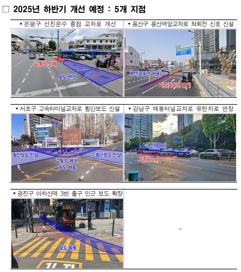 연내 5개 지점에 대한 추가 개선 사업도 완료 예정이다. ▴은평구 선진운수 종점 교차로 도로구조 개선 ▴용산구 용산역 앞 교차로 좌회전 신호 신설 ▴서초구 고속터미널교차로 횡단보도 설치 ▴강남구 매봉터널교차로 유턴차로 연장 ▴광진구 아차산역 3번출구 인근 보도 확장 등이 대상이다.
