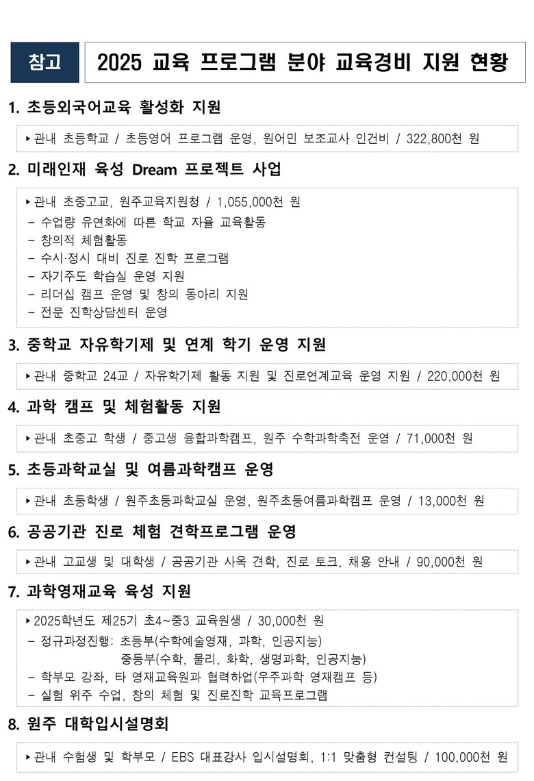 올해 원주시 교육경비 전체 예산 165억 원 중 19억 원이 학력 향상 및 맞춤형 인재 양성을 위한 8개의 교육 분야 프로그램에 지원되며, 교육지원청을 통해 각급 학교에 배부된다.