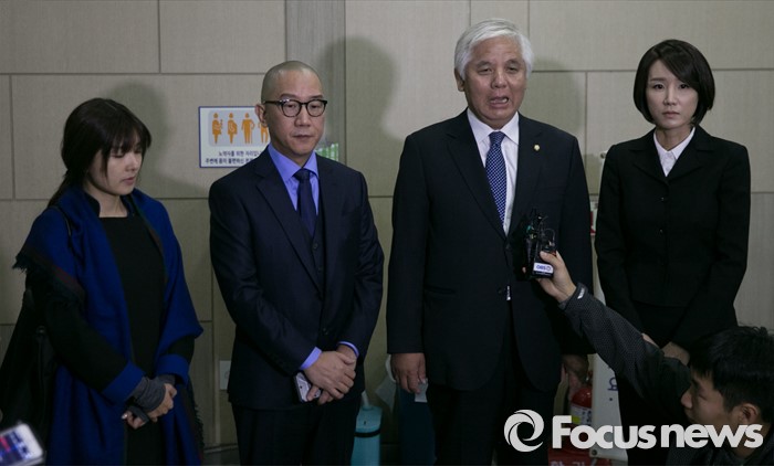 | △ 23일 오전 서울 여의도 국회에서 김정록(오른쪽 두번째) 새누리당 의원, 방송인 남궁연(왼쪽 두번째), 故 가수 신해철의 부인 윤원희(오른쪽 첫번째) 씨 등이 신해철법('의료사고 피해구제 및 의료분쟁 조정 등에 관한 법률안) 심사 촉구에 관한 청원서를 제출한 뒤 취재진 질문에 답하고 있다. <사진제공=포커스뉴스> |