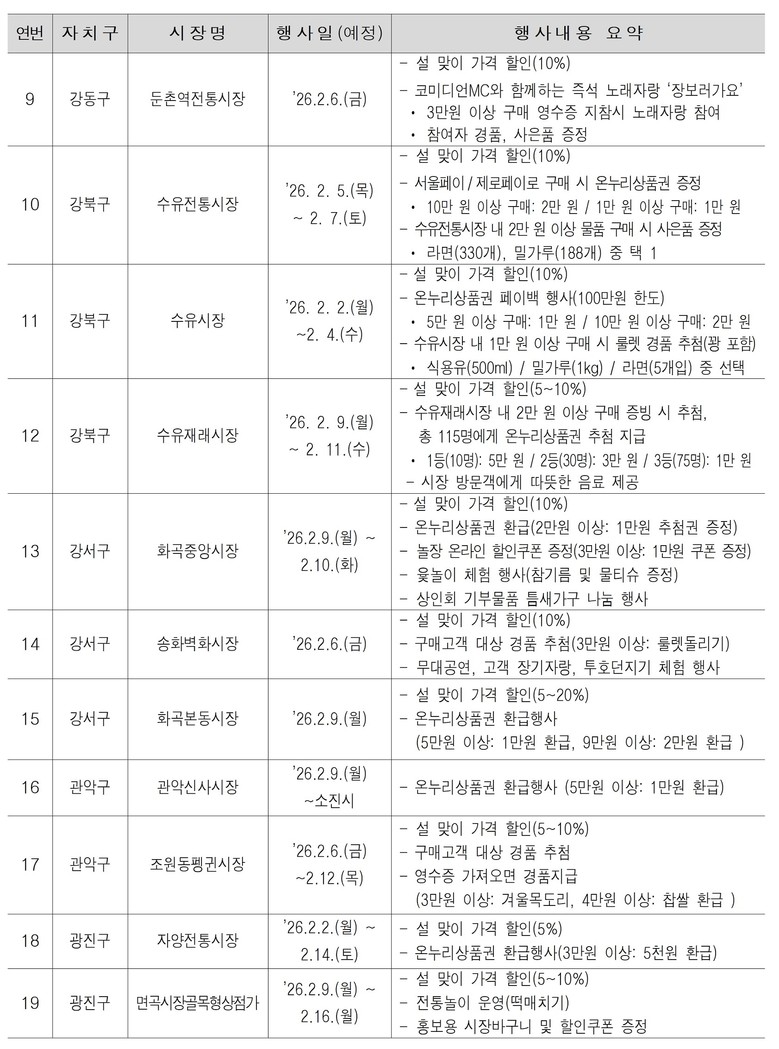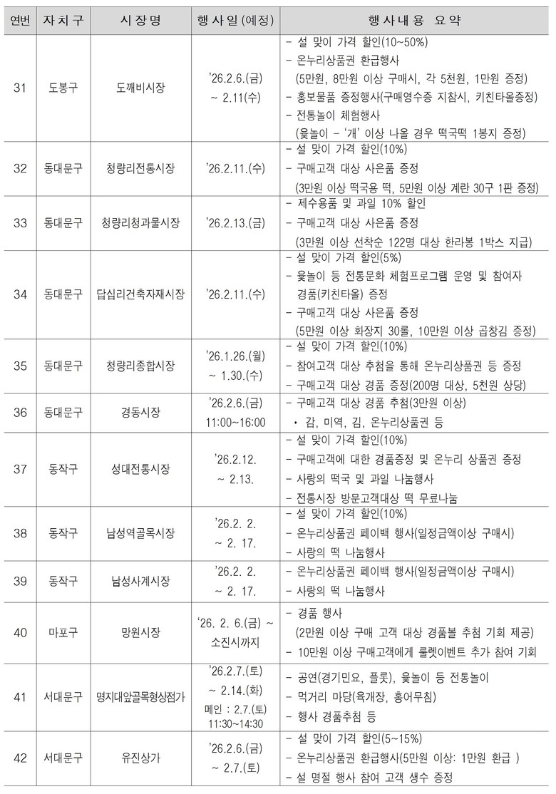 가격 할인과 함께 명절 분위기를 살리는 전통문화 공연과 체험 행사(떡메치기, 제기차기 등)도 마련된다. 이 밖에도 시장별 온누리상품권·사은품 증정 등도 함께 진행해 시민들의 설 장바구니 부담을 낮추고 전통시장 소비를 촉진할 계획이다.