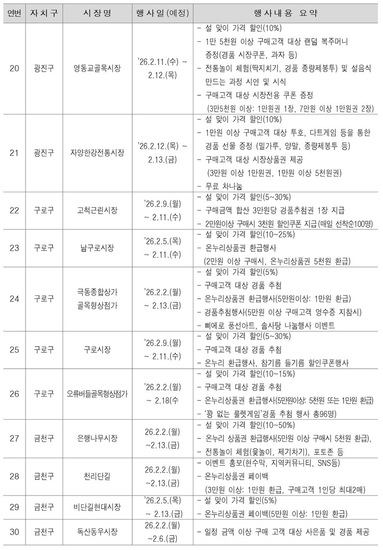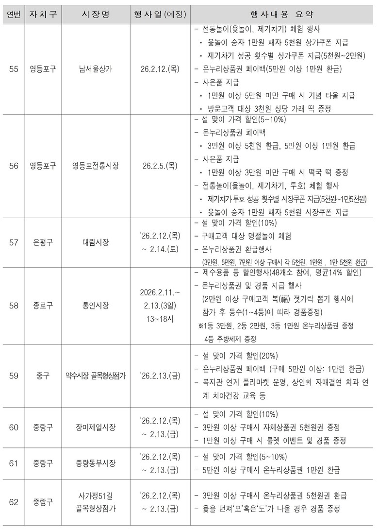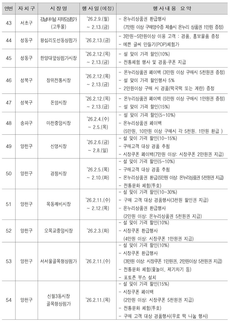 특별이벤트 참여 전통시장(상점)은 서울시 누리집(www.seoul.go.kr, 분야별 정보 → 경제 → 소상공인지원 → 전통시장 조성 → 전통시장 행사안내)에서 확인할 수 있으며, 이벤트 기간과 행사 프로그램은 시장별로 달리 운영한다.