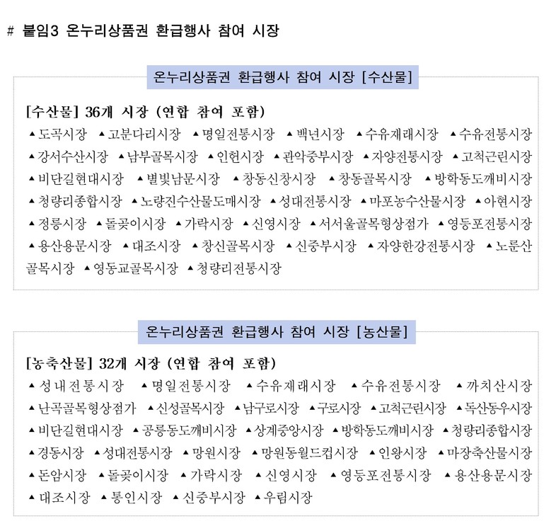 온누리상품권 환급행사와 관련된 자세한 내용은 해양수산부 행사 누리집(www.fsale.kr)과 농림축산식품부 행사 누리집(sale.foodnuri.go.kr)에서 확인할 수 있다.