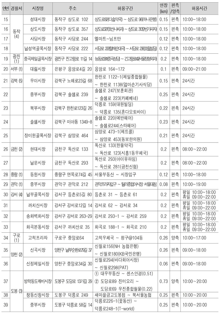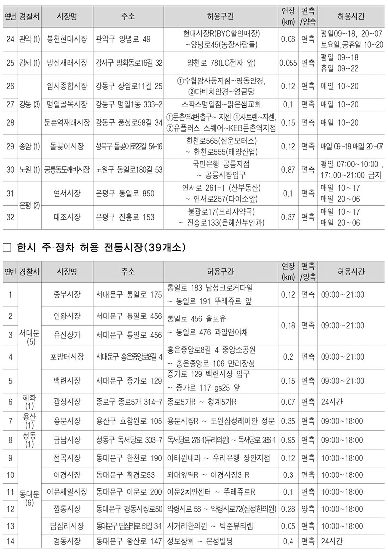 서울시는 전통시장을 찾는 시민들의 편리한 시장 이용을 위해 18일(수)까지 무료 주정차 대상 시장을 추석 대비 3개소 늘려 71개소를 운영한다. 대상 시장은 관할 경찰서별로 운영 기간과 시간이 달라, 자세한 내용은 서울시 누리집 내 ‘새소식’에서 확인할 수 있다.